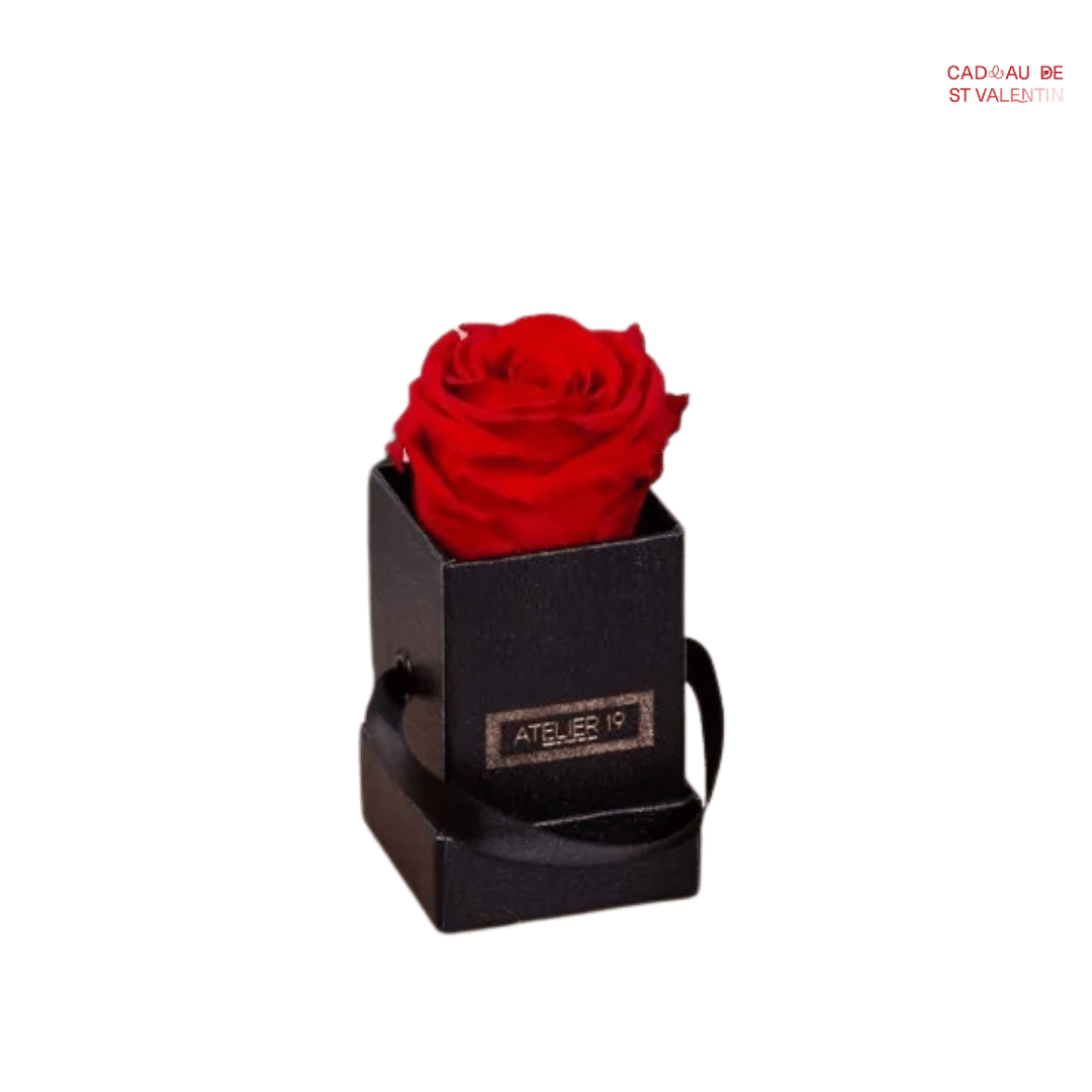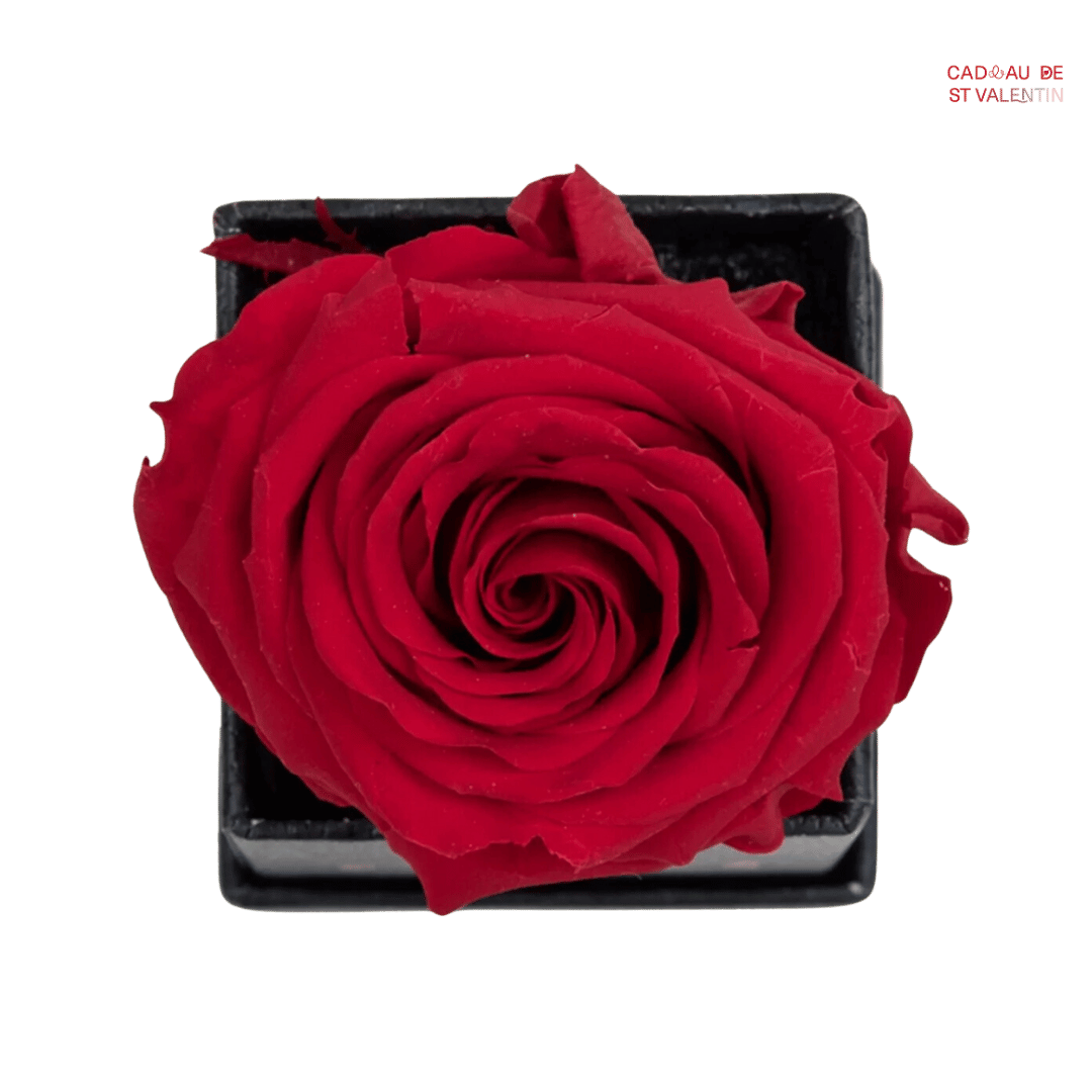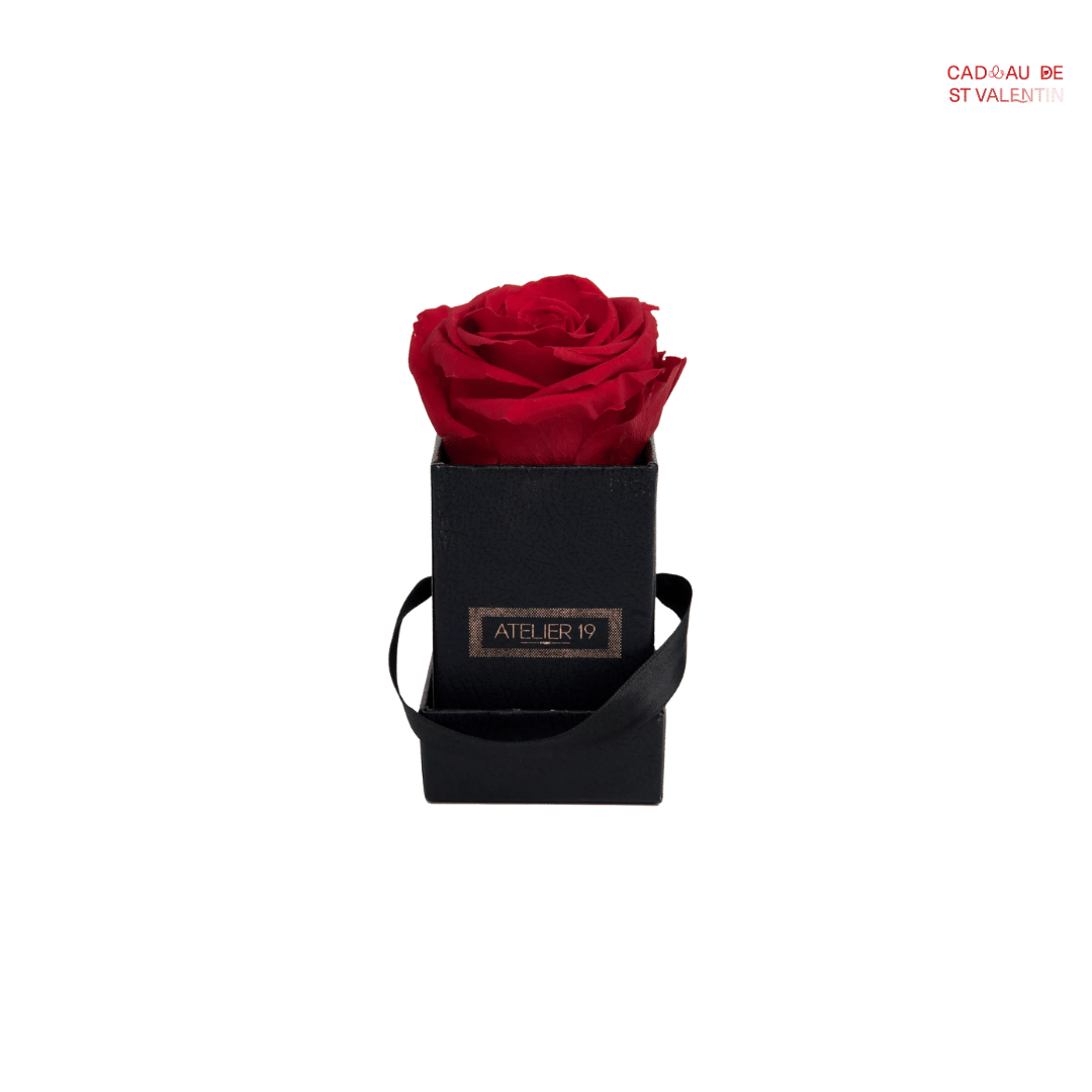 1 rose éternelle Premium rouge passion, naturelle et préservée dans un élégant coffret carré, aspect cuir grainé noir.